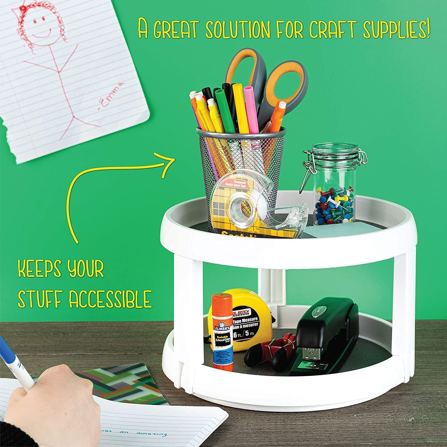 Have easy access to your spices, condiments and more with the Two-Tier Rotating Spice Rack. This round turntable is sturdy and lightweight, great for kitchens, bathrooms and offices with limited counter space or small cabinets. The two tiers have ample clearance, ideal for spice and condiment containers, dishes, toiletries and skincare products. This rotating display features smooth 360 degrees turning, making it perfect for storage and display. This organiser also has a non-skid rubber liner and raised edge to help keep items in place.