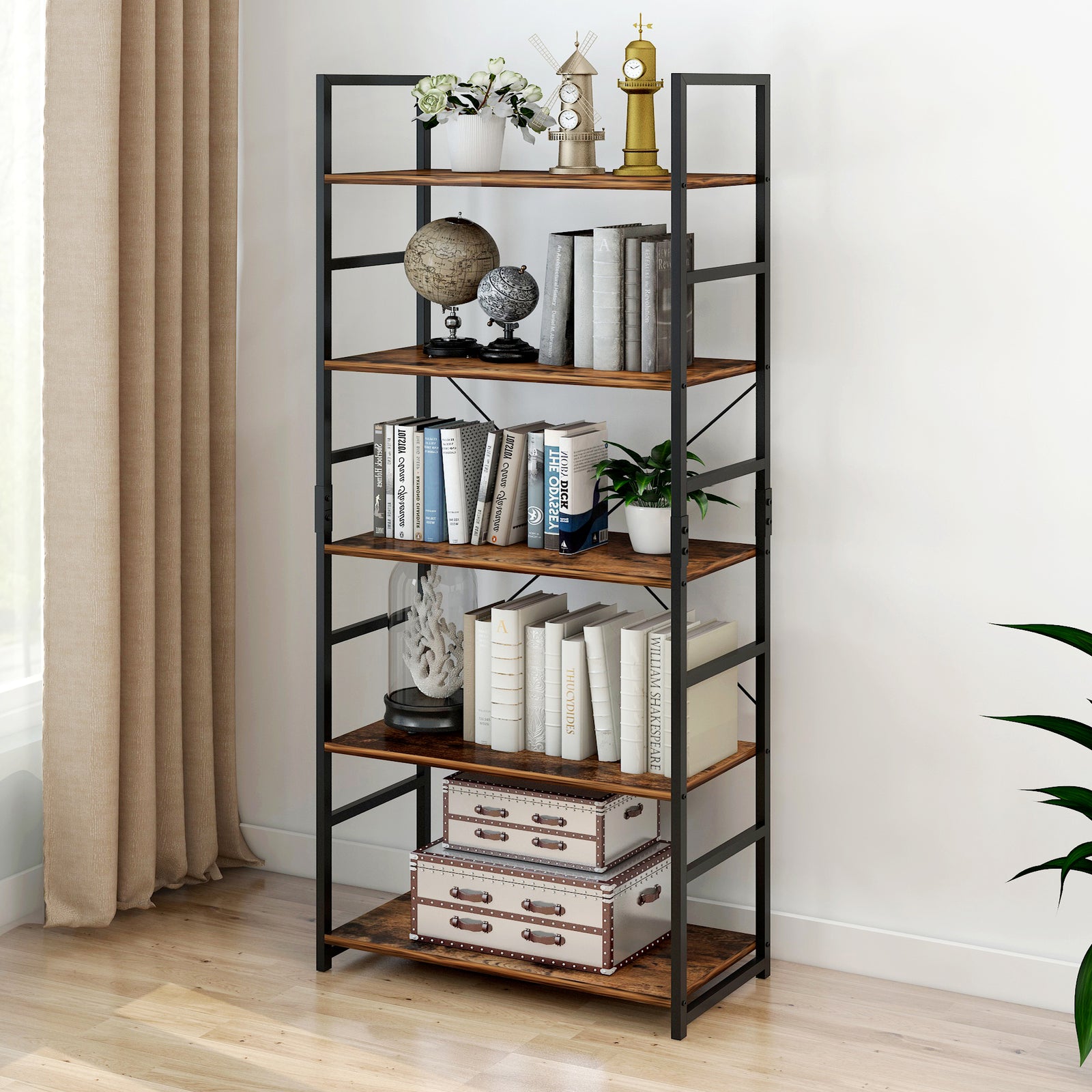 Deluxe Rustic Wood and Steel 5 Tier Industrial Bookcase Storage Shelf