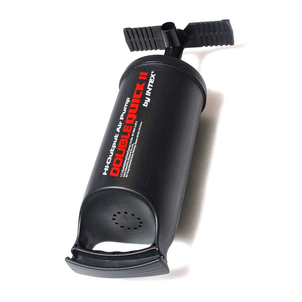 The Intex High Output Double Quick II Hand Pump was designed for great efficiency and allows you to quickly inflate just about anything anywhere. Pumps air on the fore and back stroke and comes with a long hose and three interconnecting nozzles. You can use these nozzles to fit a variety of inflatables. It has a high volume output and fills your inflatables faster than a normal hand pump. It is light weight and compact for ease of use. Perfect for the beach or camping trip.